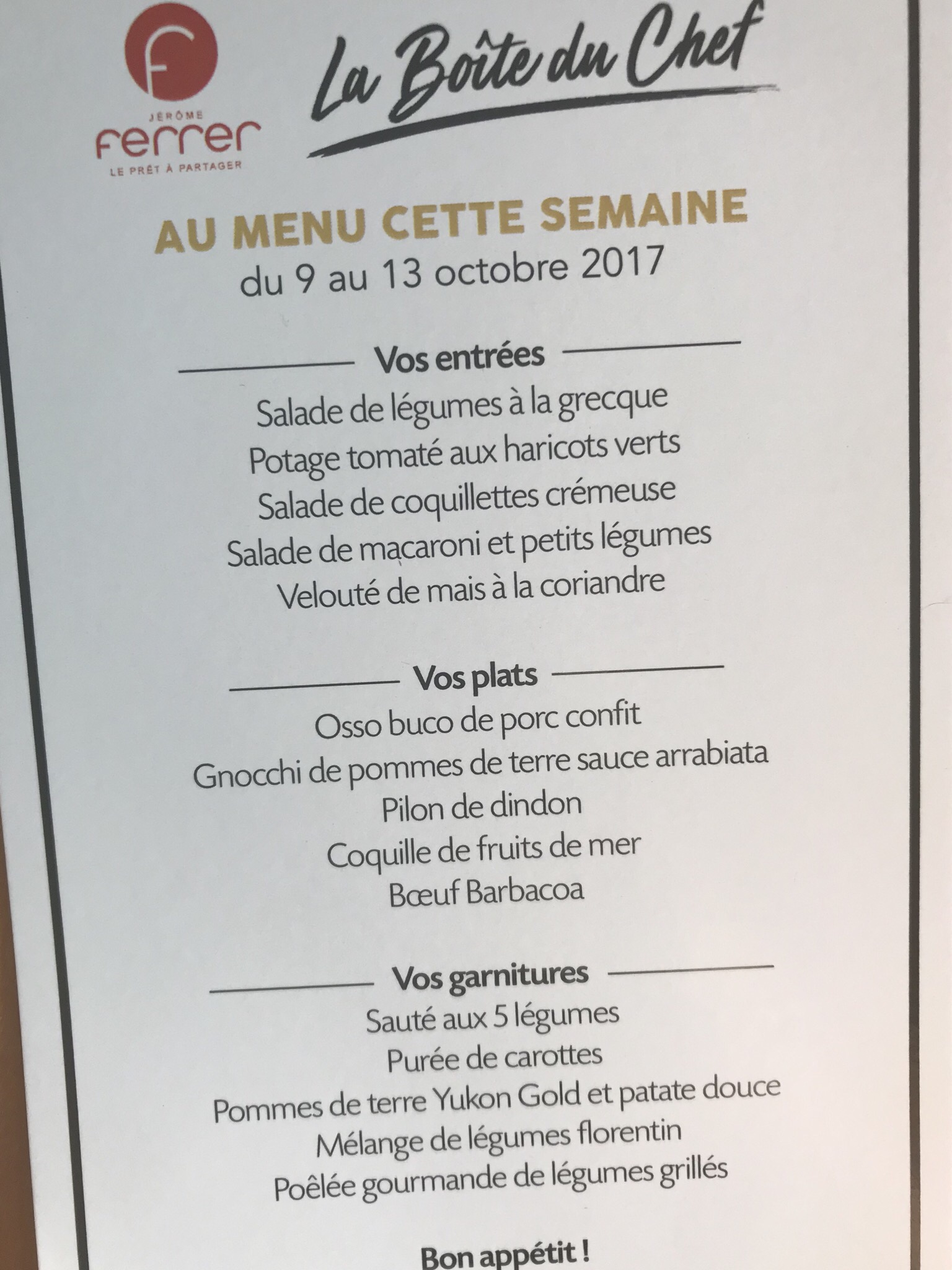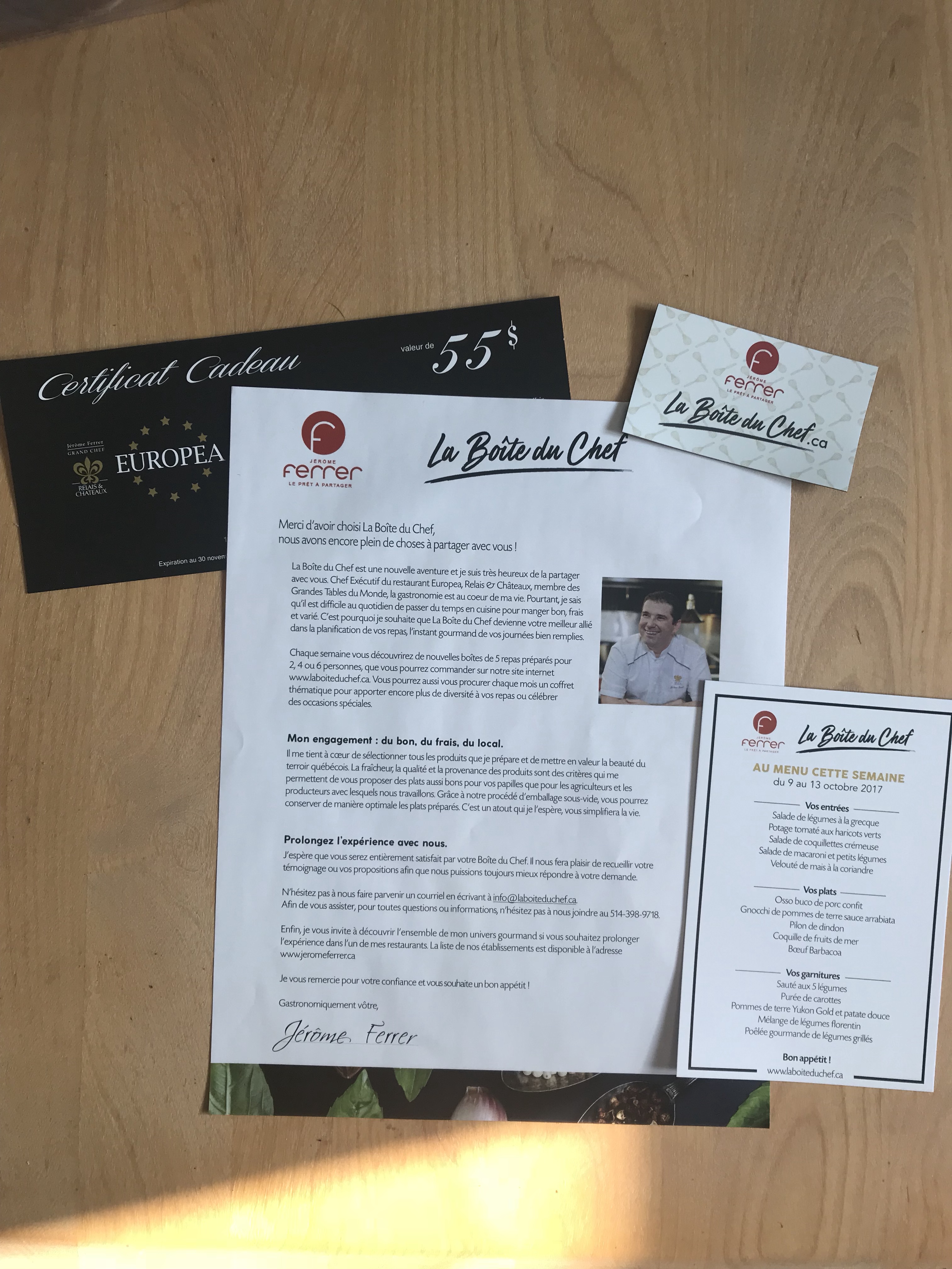 La boîte du chef de Ferrer consiste, à la base, à 5 entrées et 5 repas avec accompagnements pour un minimum de 2 personnes. Là je t’entends me demander: « Jérôme Ferrer, le proprio de l’Europea, te fait du meal prep pour ta semaine? Ça doit coûter une fortune!? » Et ben ramasse ta mâchoire à terre parce que pour la modique somme de 115$, t’as la chance de bouffer comme un roi pendant 5 jours sans avoir à courrailler à l’épicerie pis à te taper des heures de préparation! Et ça, c’est pour 2 personnes! Si t’as une famille, t’en prends plus, pis quand t’es célibataire comme moi, tu congèles!